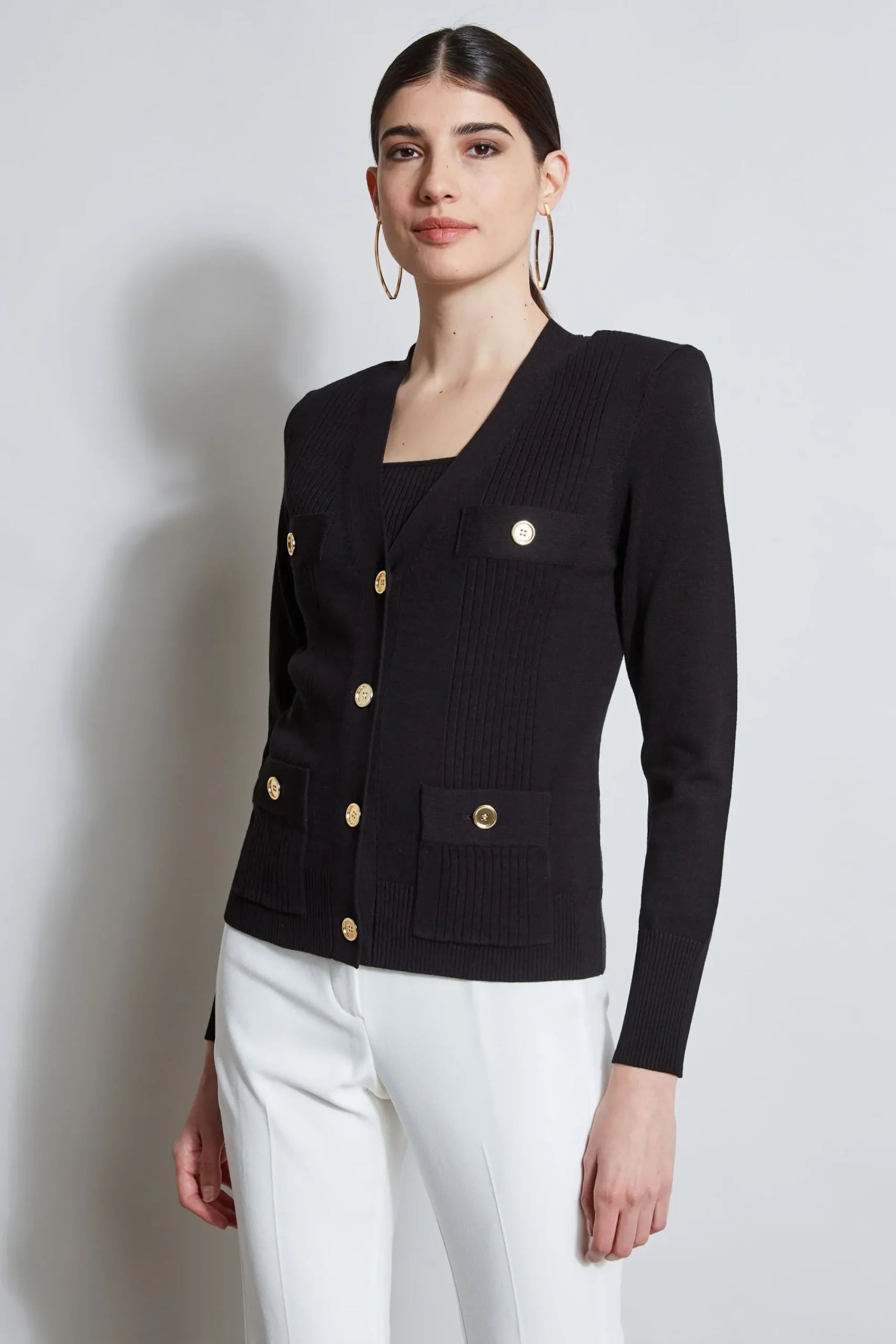 Designed to be your next go-to cardigan. Our body skimming Ribbed Sweater has a deep v-neck and is detailed with gold buttons. Wear it on its own or layered with its matching sweater rib tank – perfect for day or a cool evening out. Elie Tahari Exclusive Ribbed V-Neck Cardigan with Metallic Buttons 72% Viscose, 28% Polyester Runs true to size. Model is 5’10.5″ and wearing size S Length From Shoulder to Hem: Sleeve 24″L, Back 23″L (approx. length for size S) Dry Clean Only Imported Style #: E25XA514