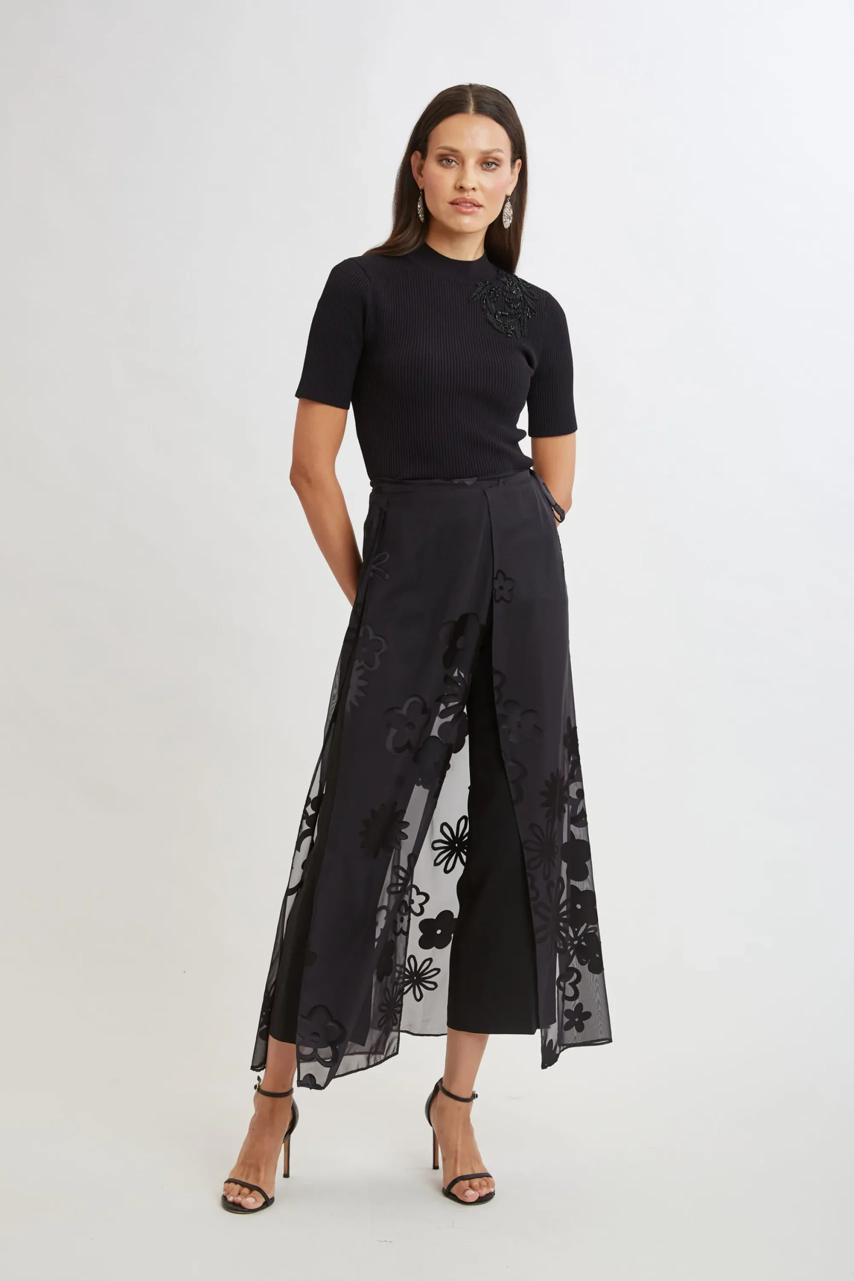 Our free-flowing pant is two looks in one. The Fluid Crepe pant features a removable Floral Burnout Satin Apron Overlay …