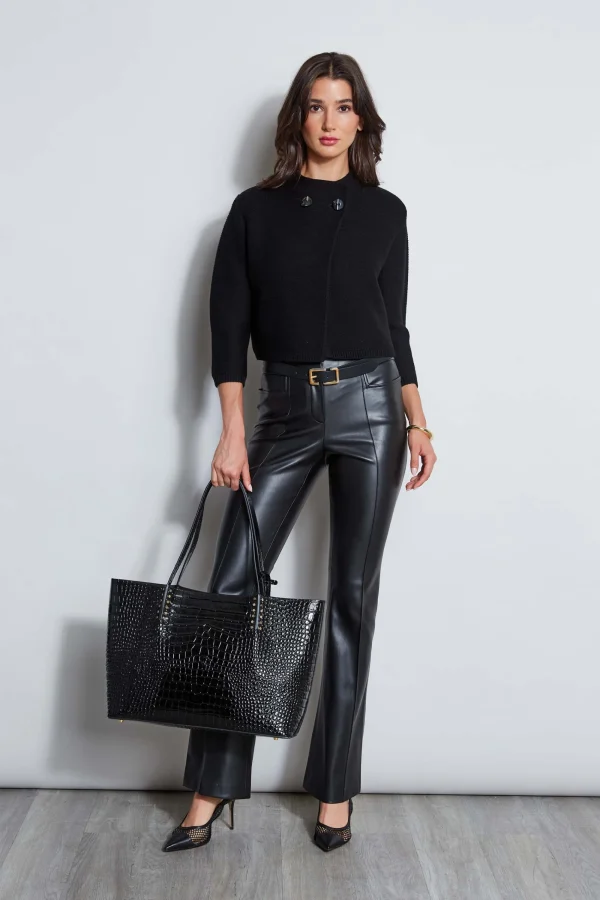 Soft to the touch, you will fall in love with our Vegan Leather Pants. The pintuck detail gives it a designer attitude while the modern straight leg flare cut gives it a cool vibe perfect for pairing with Fall’s statement prints, knits or jackets. Reach for our Italian Belts for the finishing touch. Elie Tahari Exclusive Vegan Leather Straight Leg Pants with Pintuck Detail 50% Polyester, 50% Polyurethane Runs true to size. Model is 5’9″ and wearing size 2 Measurements: 10″L Front Rise, 33.5″ L Inseam (approx. length for a size 6) Dry Clean Only Imported Style #: E80AM214