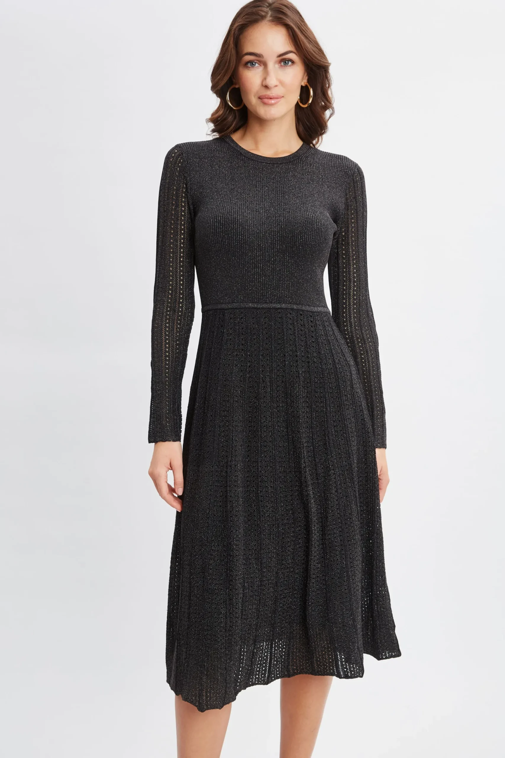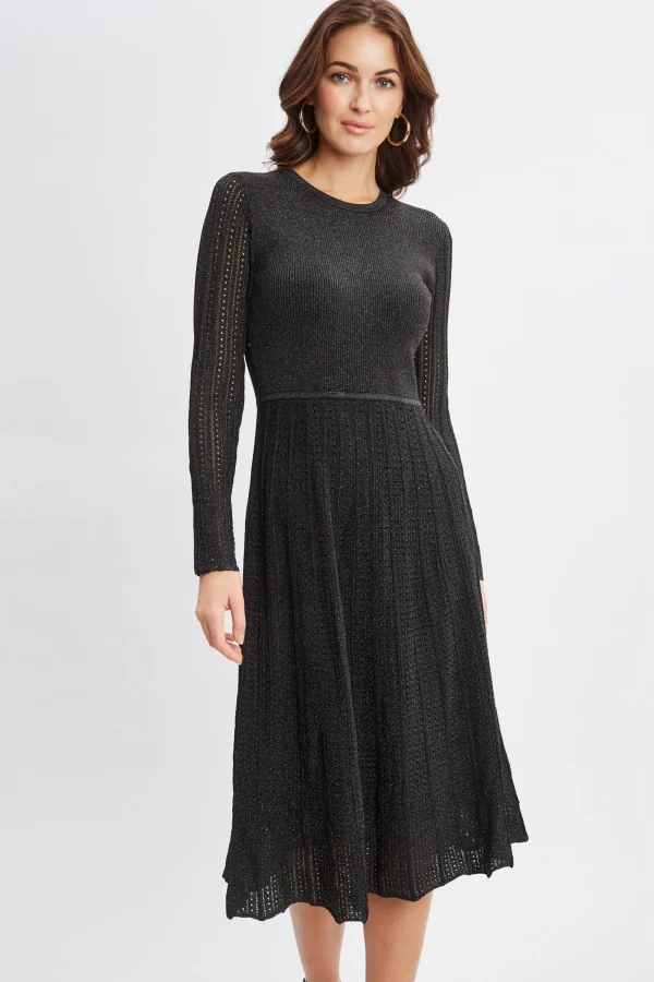 Our luxe Metallic Kissed Lurex Midi Dress is an elevated take on Fall‚Äö√Ñ√¥s knit dress trend. Featuring a Fit u0026amp; Flare silhouette with panel pleats, it is ultra-versatile u0026amp; can be easily dressed up with heels or down with knee grazing boots.¬¨‚Ć Long Sleeve Pleated Metallic Lurex Sweater Dress 65% Viscose 35% Nylon Runs true to Size Model is 5’9″ and wearing size S Dry Clean Only Imported Style #: ETR45225