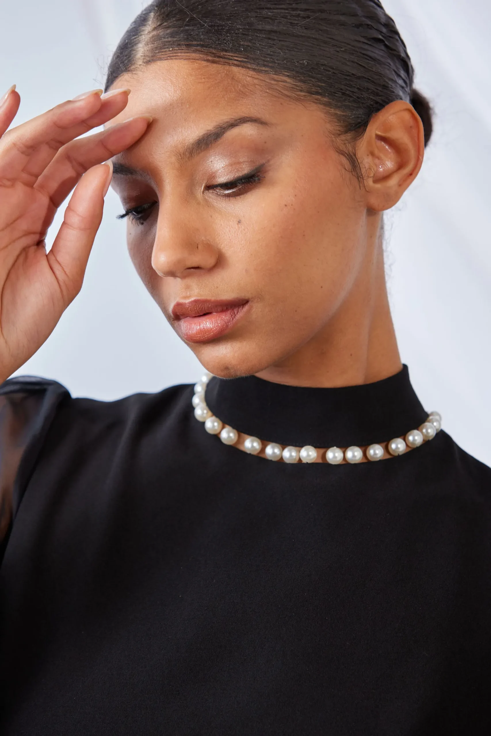 Go flirty chic in our Pearl Detail Crepe Dress. The mock neck and shift silhouette contrast with the soft chiffon sleeve…