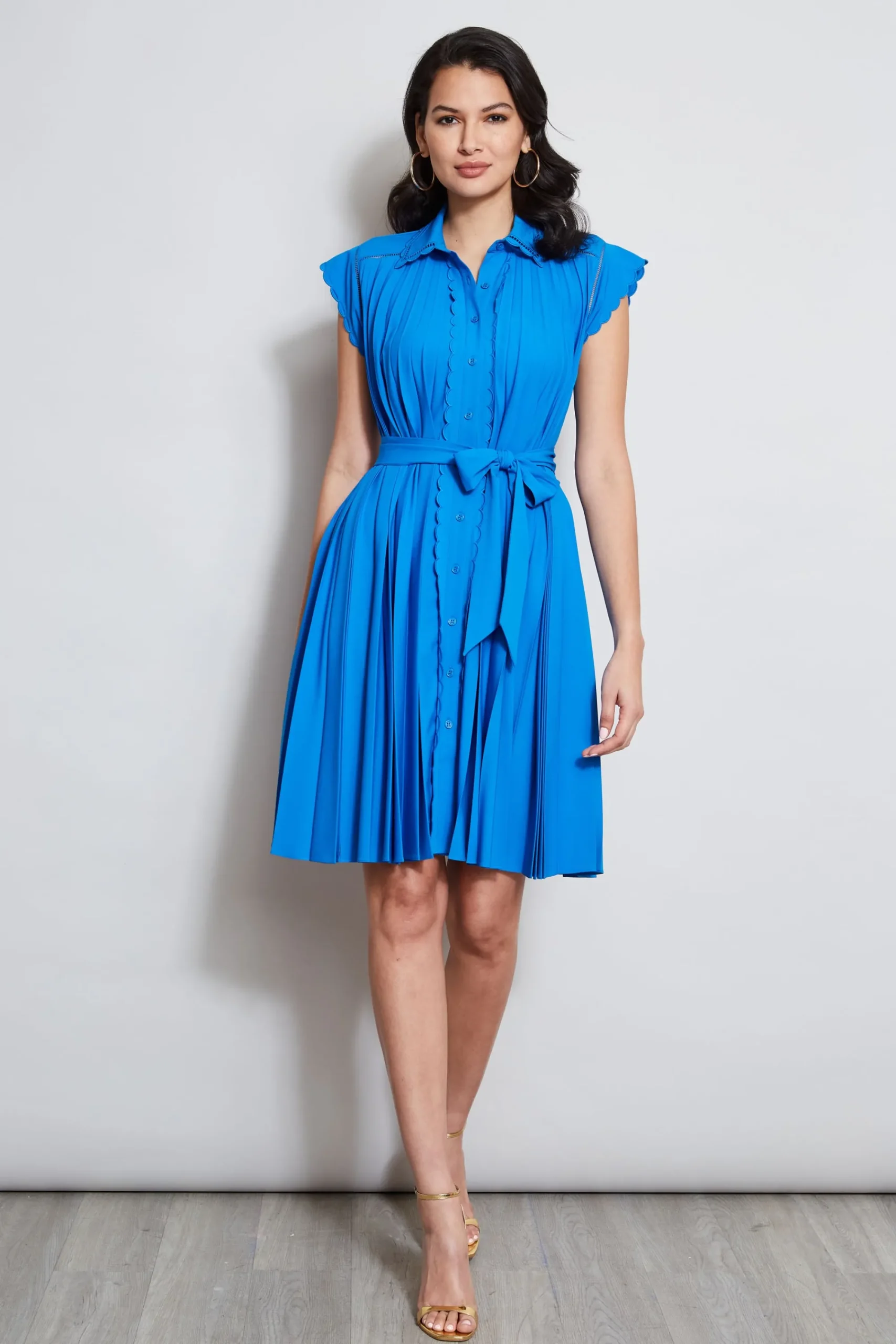 The easiest shirt dress is elevated with accordion pleading that begins at the shoulder and extends to the hem. Designed with scallop edges on the sleeve, collar u0026amp; placket, cinch the waist with its self-sash belt. Pleated Collared Dress with Self-Sash u0026amp; Scallop Detailing 91% Polyester, 9% Spandex Runs true to size. Model is 5’9″ and wearing size S Measurements: 40″ L Shoulder to Hem (approx. measurement for size 6) Imported Style # ETR41148