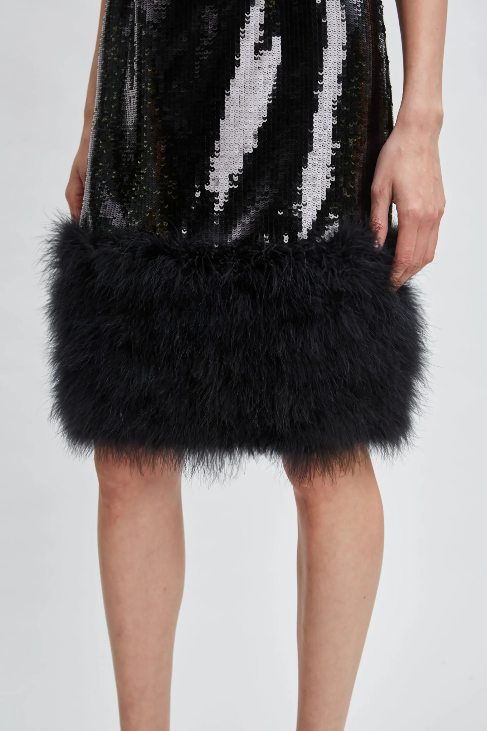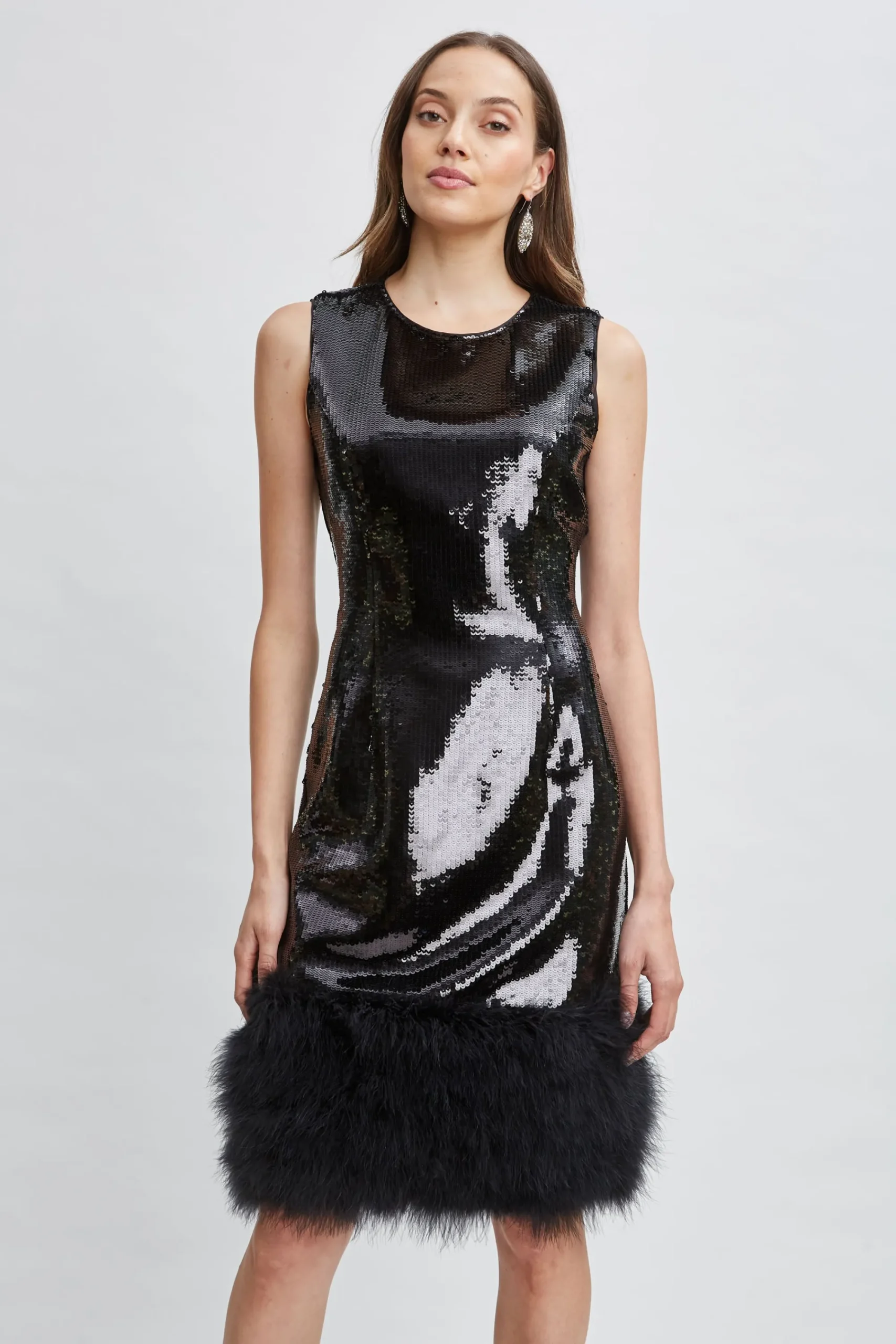 Shine on in Elie’s Midi Dress in modern Sequins. Perfect for special occasions and weddings, this eye-catching dress ensures you stand out with its captivating patina of sequins. Designed with a faux fur hem, this dress has the “IT ” factor. Its chic minimalist design makes it the perfect occasion dress. Sleeveless Sequin Midi Dress with Feather Hem 100% Polyester Runs true to Size Model is 5’9″ and wearing size S Dry Clean Only Imported Style #: ETR44360