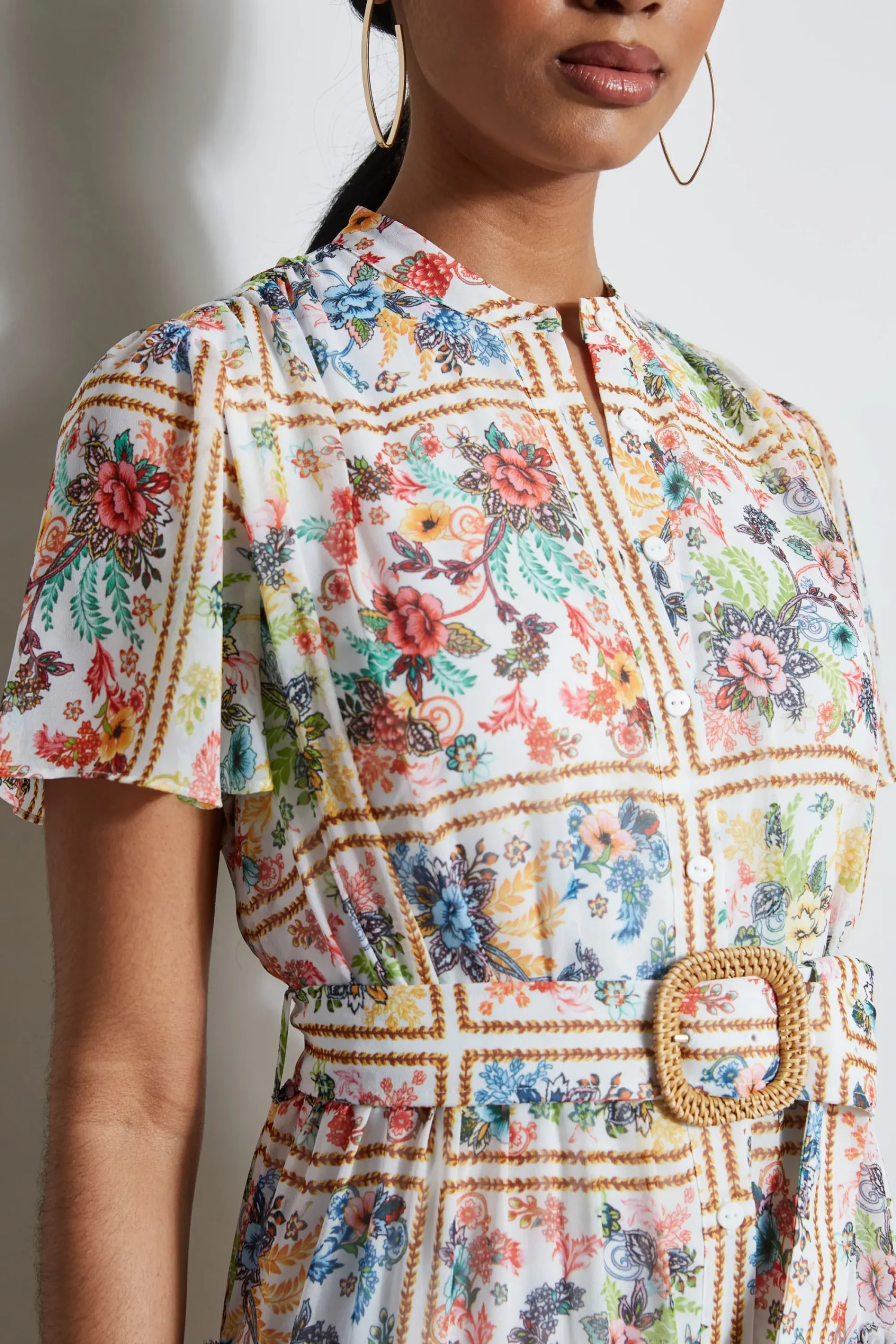 Effortless u0026amp; playful, the raffia belt buckle on the self-sash of Floral Summer Palace Print dress gives it an artistic edge. Designed with a band collar u0026amp; a tiered full skirt, this floral print shirt dress speaks the language of summer. Dress it down with flats or up with sexy sandals for a special occasion. Short Sleeve Floral Printed Midi Dress with Self Sash u0026amp; Raffia Belt Buckle 100% Polyester Chiffon Runs true to size Model is 5’9″ and wearing size S Dry Clean Only Imported Style #: ETR41316