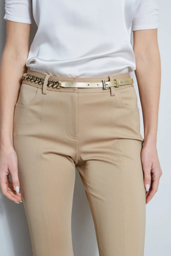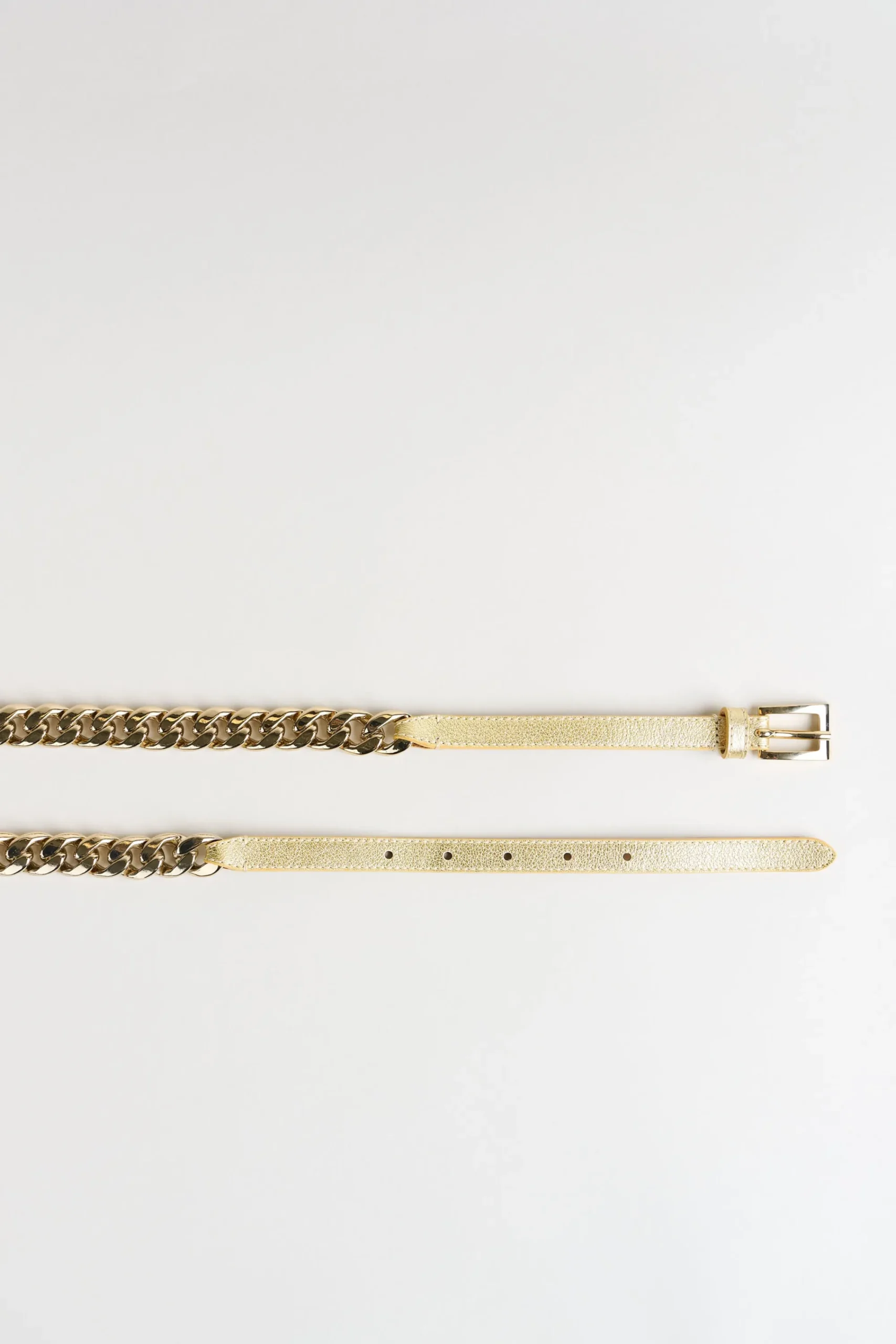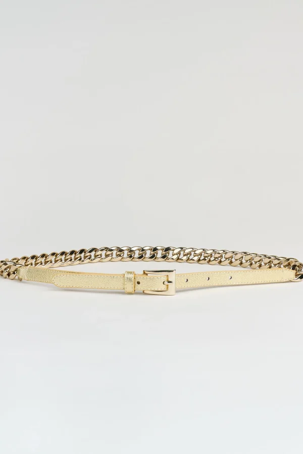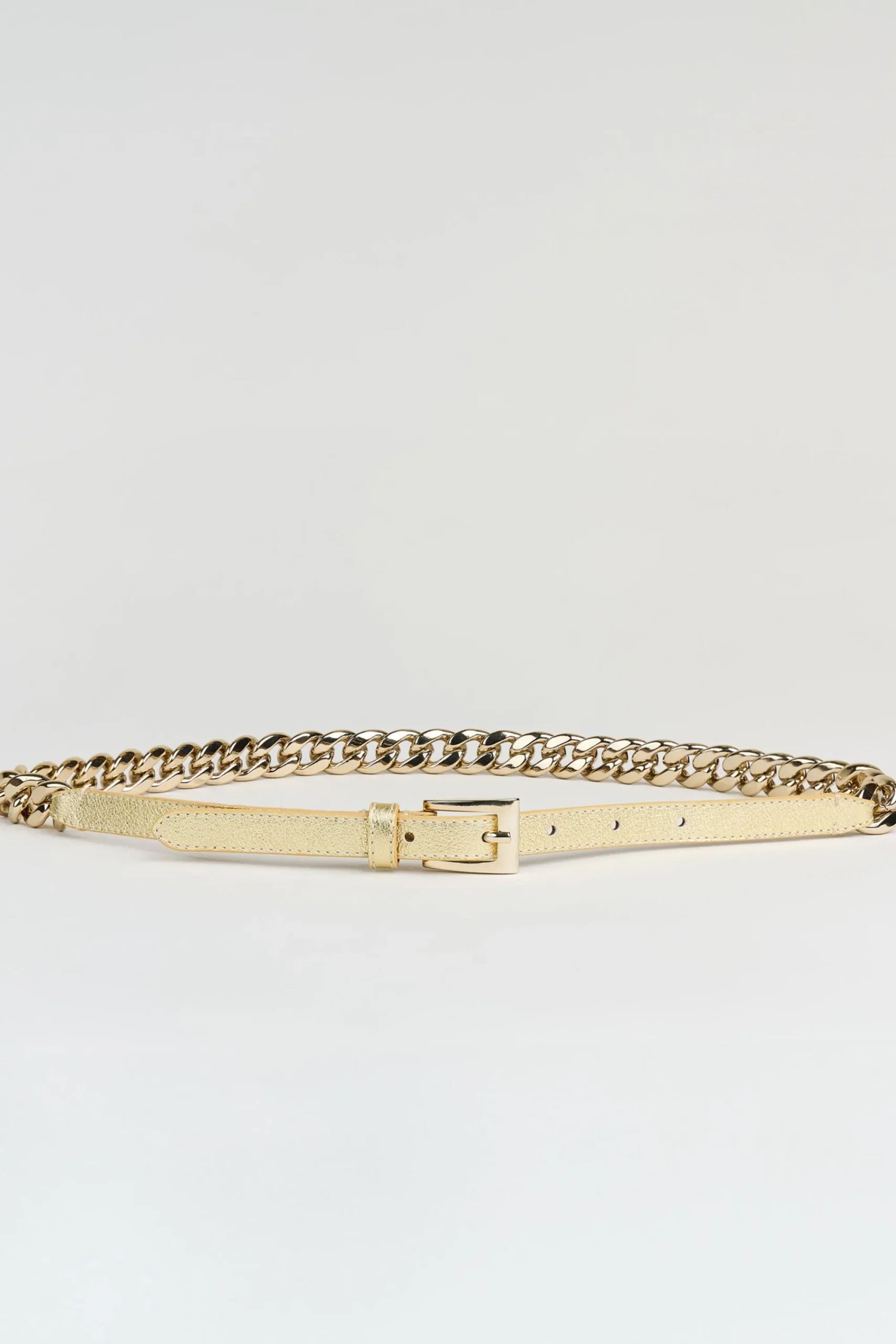 The “IT” accessory for Spring. Add an effortless glam factor to any look with our gold chain link belt. We love it worn with a suit or dress – style meets function with the must-have belt of the season. Wear it buckled in the back for an all chain look, or wear it buckled in the front highlighting its modern leather tab closure and gold buckle. Gold Brass Chain Metallic Leather Belt 100% Leather, Gold Made in Italy A815G003
