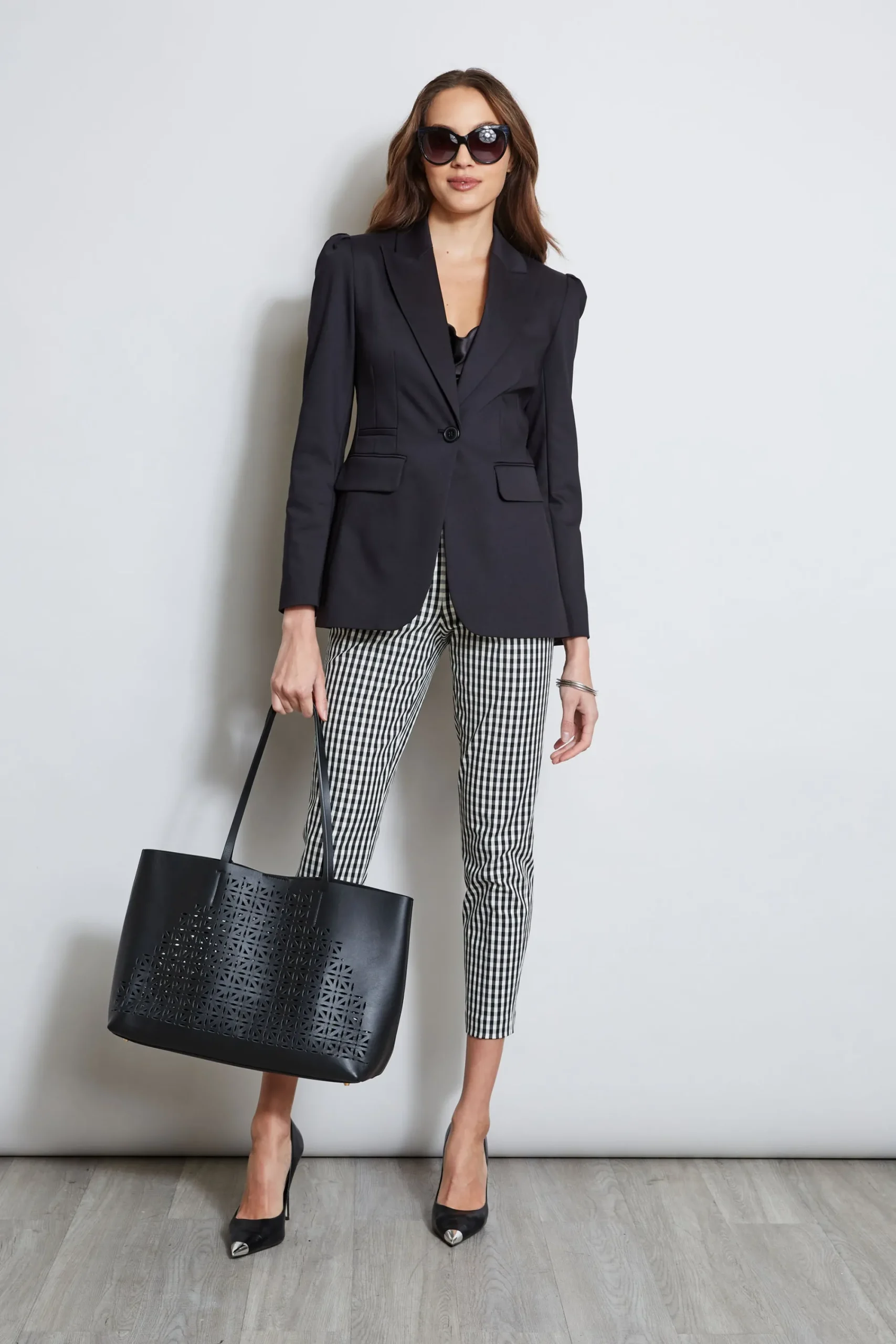 Meticulously tailored, polished, and modern, our single-breasted blazer has pleat detail shoulders, peaked lapels u0026amp; dart detailing. The contour lines u0026amp; flattering button placement lend a body skimming silhouette. This cotton blend blazer has the cool factor you are looking for. Pair it with its matching pant for a sleek monotone column or wear it as a separate. Elie Tahari Exclusive Cotton Blend Puff Shoulder One-Button Slim Fit Blazer 63% Cotton, 34% Polyester, 3% Elastane Runs true to size. Model is 5’9″ and wearing size 2 Length From Shoulder to Hem: Sleeve 33 “L, Back 27.5″L (approx. length for size 6) Dry Clean Only Imported Style #: E302G104
