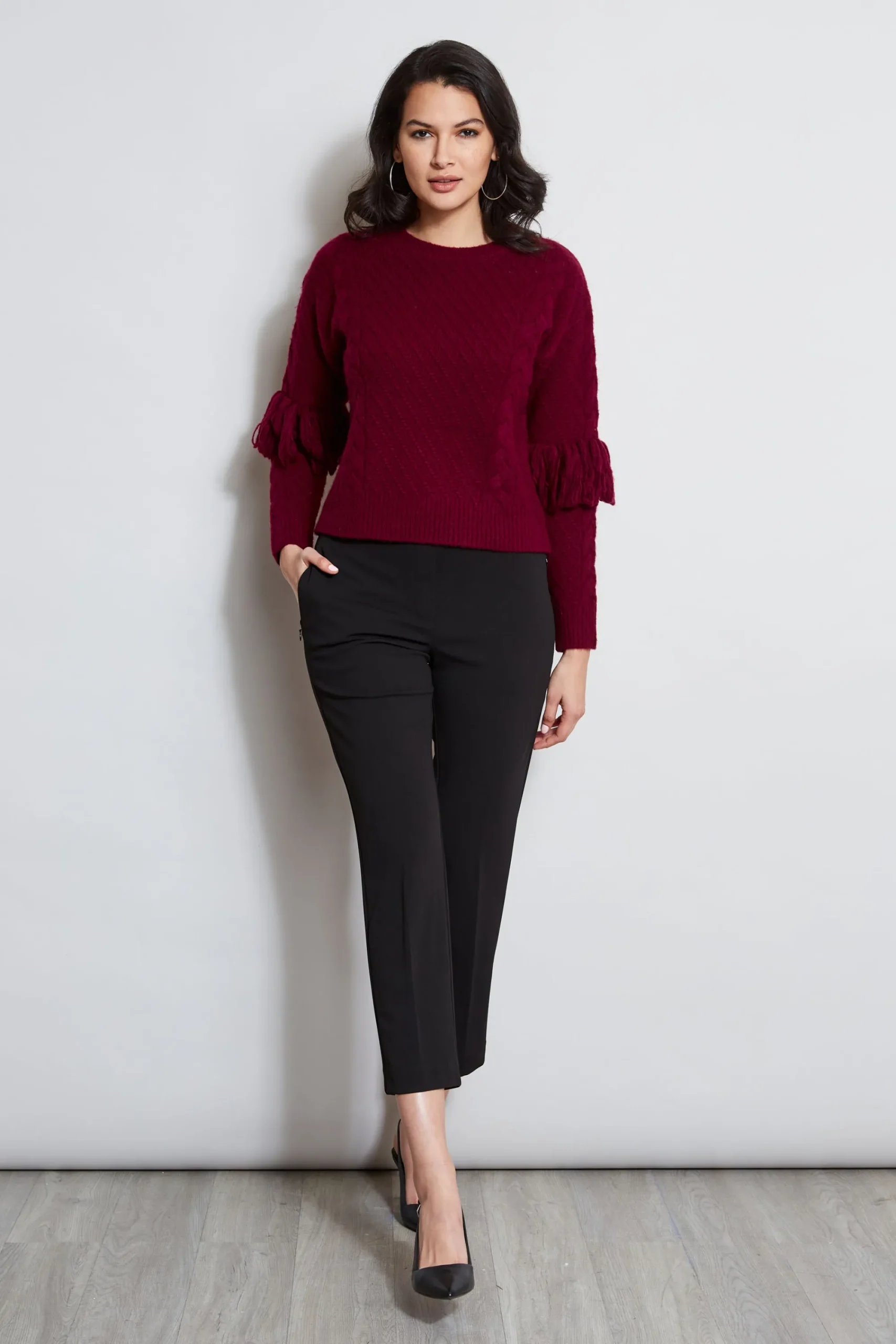 Elevate your wardrobe with our Cable-Knit Crewneck sweater. Designed in luxurious Cashmere Merino Wool Blend, this sweater features fringe at the elbows for a chic take on a classic. Long Sleeve Crew-Neck Cashmere Merino Wool Pullover Sweater 57% Super Fine Merino, 25% Cashmere, 18% Nylon Relaxed Fit; Runs true to Size Model is 5’9″ and wearing size S Length From Shoulder to Hem: Back 22.5″ L (approx. length for size S) Dry Clean Only Imported Style #: ETR22545