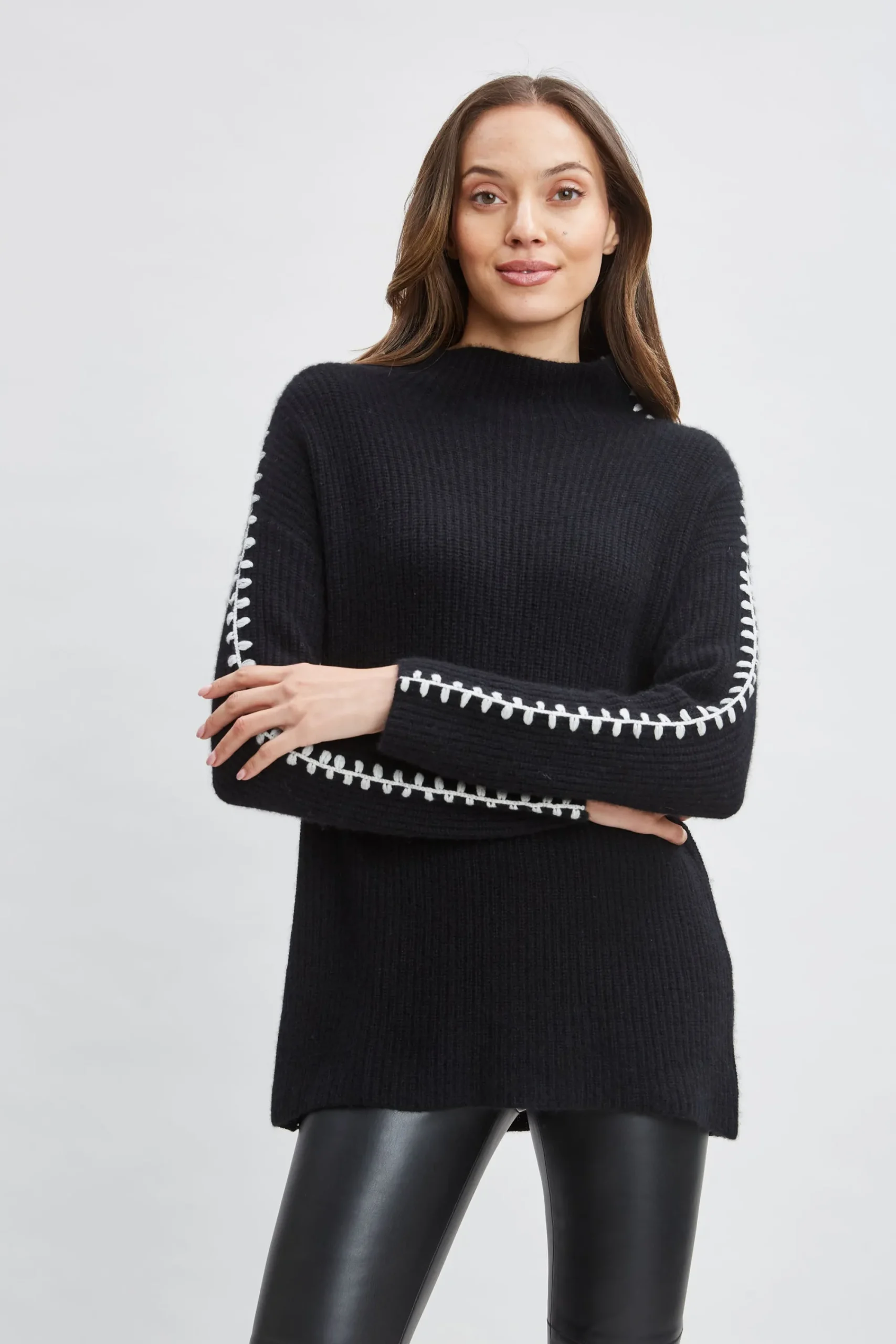 Graphic whip stitching from the funnel neck to the cuff details our relaxed fit sweater. Perfect for when the temperature drops, you will love the soft hand feel of this ultra-soft Cashmere yarn. Long Sleeve Cashmere Sweater with a Relaxed Fit u0026amp; Stitching Detail 100% Cashmere Runs true to size Model is 5’9″ and wearing size S Dry Clean Only Imported Style #: ETR34198