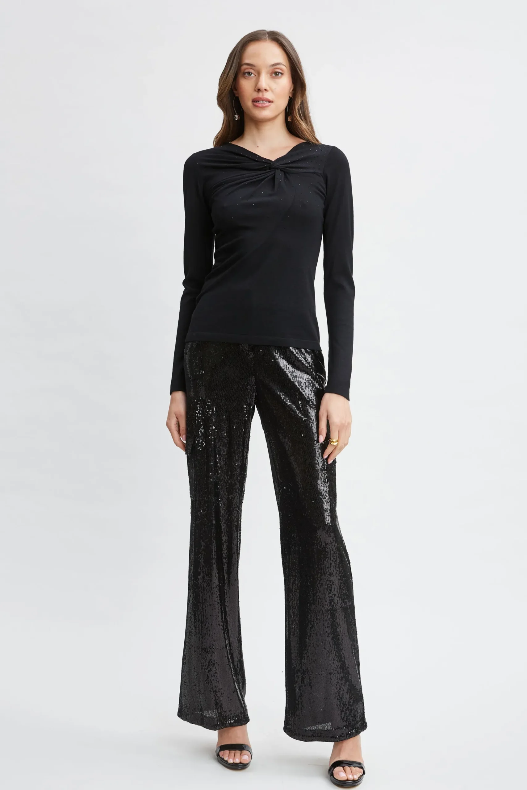 The twist front asymmetric neckline lends an artistic edge to this merino wool sweater while the heat transfer crystals add a touch of shimmer. We’re obsessed with it paired with velvet or denim. Elie Tahari Exclusive Twist Neck Knot Sweater with Heat Transfer Crystals 100% Merino Wool Runs true to size. Model is 5’9″ and wearing size S Length From Shoulder to Hem: Back 24″L, Sleeve 24.5″L (approx. length for size S) Dry Clean Only Imported Style #: ER0X5544