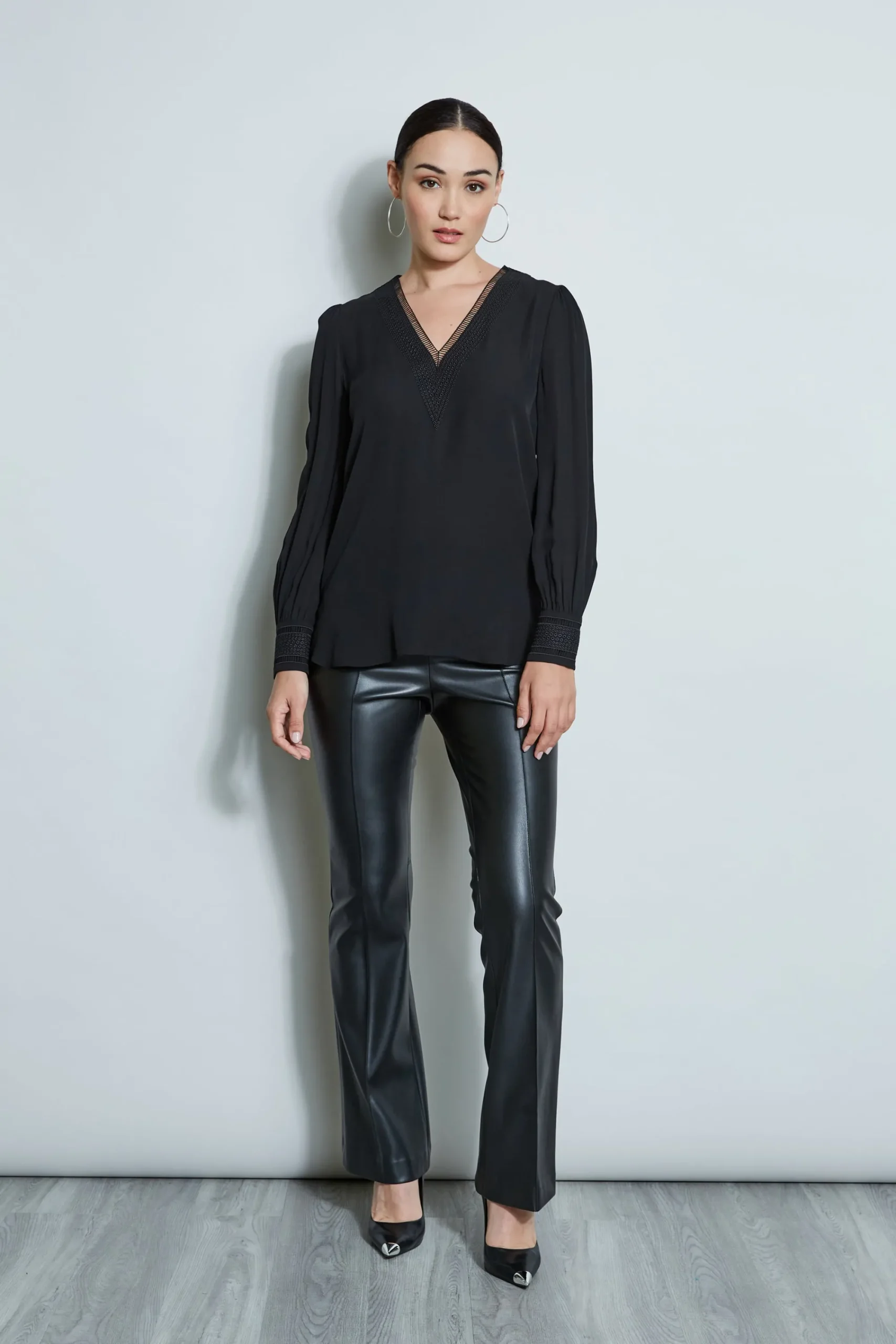 Our Silk Georgette shirt has unique geometric embroidery at the neckline u0026amp; cuffs. The soft poetic sleeves lend a feminine twist. Embroidered V-Neck Silk Long Sleeve Shirt 100% Silk Model is 5’9″ and wearing size S Length From Shoulder to Hem: Back 28″L, Sleeve: 32.5″ L (approx. length for size S) Dry Clean Only Imported Style #: ER10N513