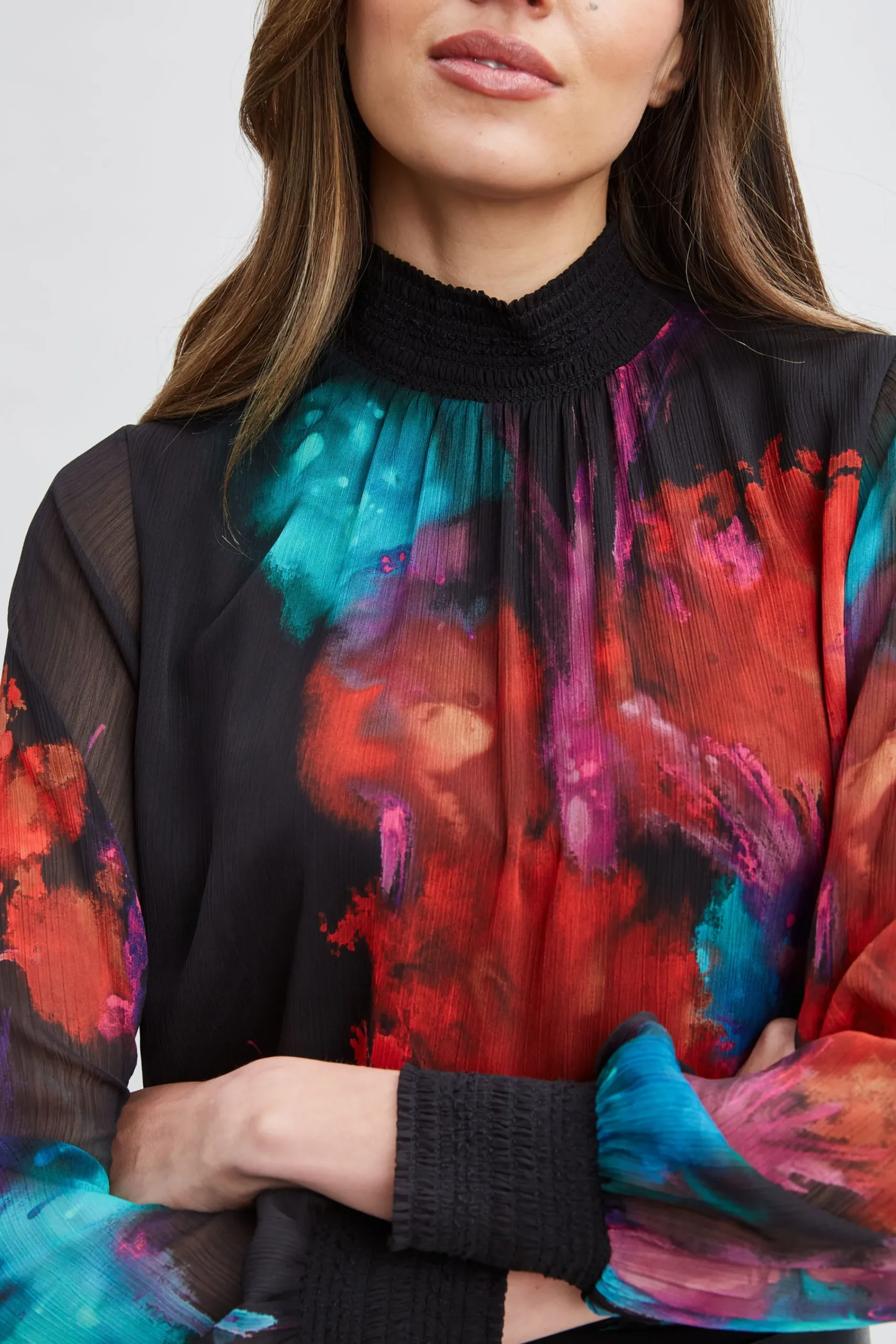We’re obsessed with our Studio Floral Print Shirt. Romantic Smocking at the neckline u0026amp; cuffs lends a poetic vibe to the beautiful watercolor motif that was hand drawn in our artist’s studio. Designed with transparent crinkle chiffon sleeves, it is perfect paired with crepe or satin. Elie Tahari Exclusive Smocked Mock Neck Long Sleeve Shirt with a Graphic Abstract Print u0026amp; Chiffon Sleeves 100% Polyester Runs true to size. Model is 5’9″ and wearing size S Length From Shoulder to Hem: Back 25.75″ L, Sleeve 24.9″ L (approx. length for size S) Dry Clean Only Imported Style #: ER052504