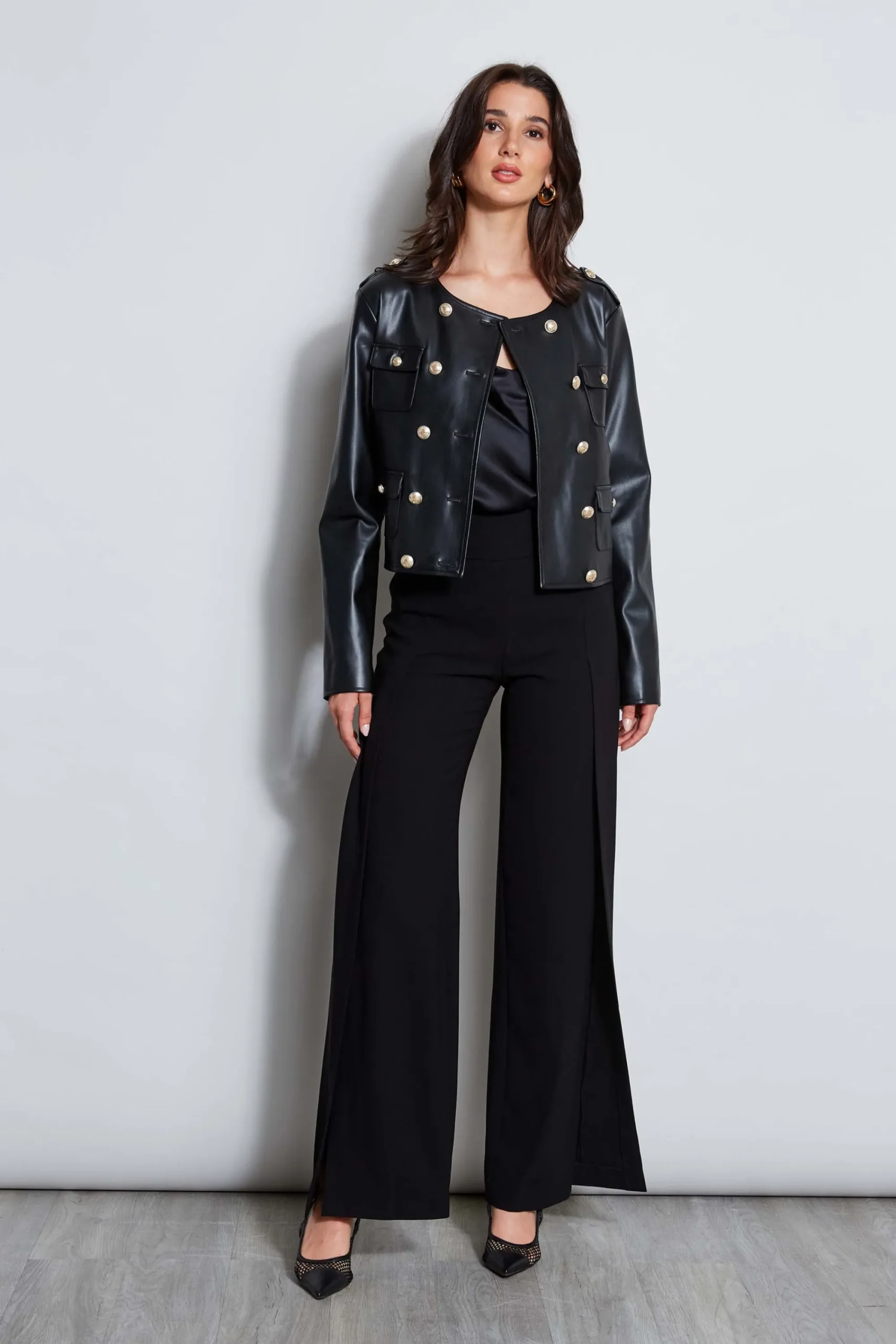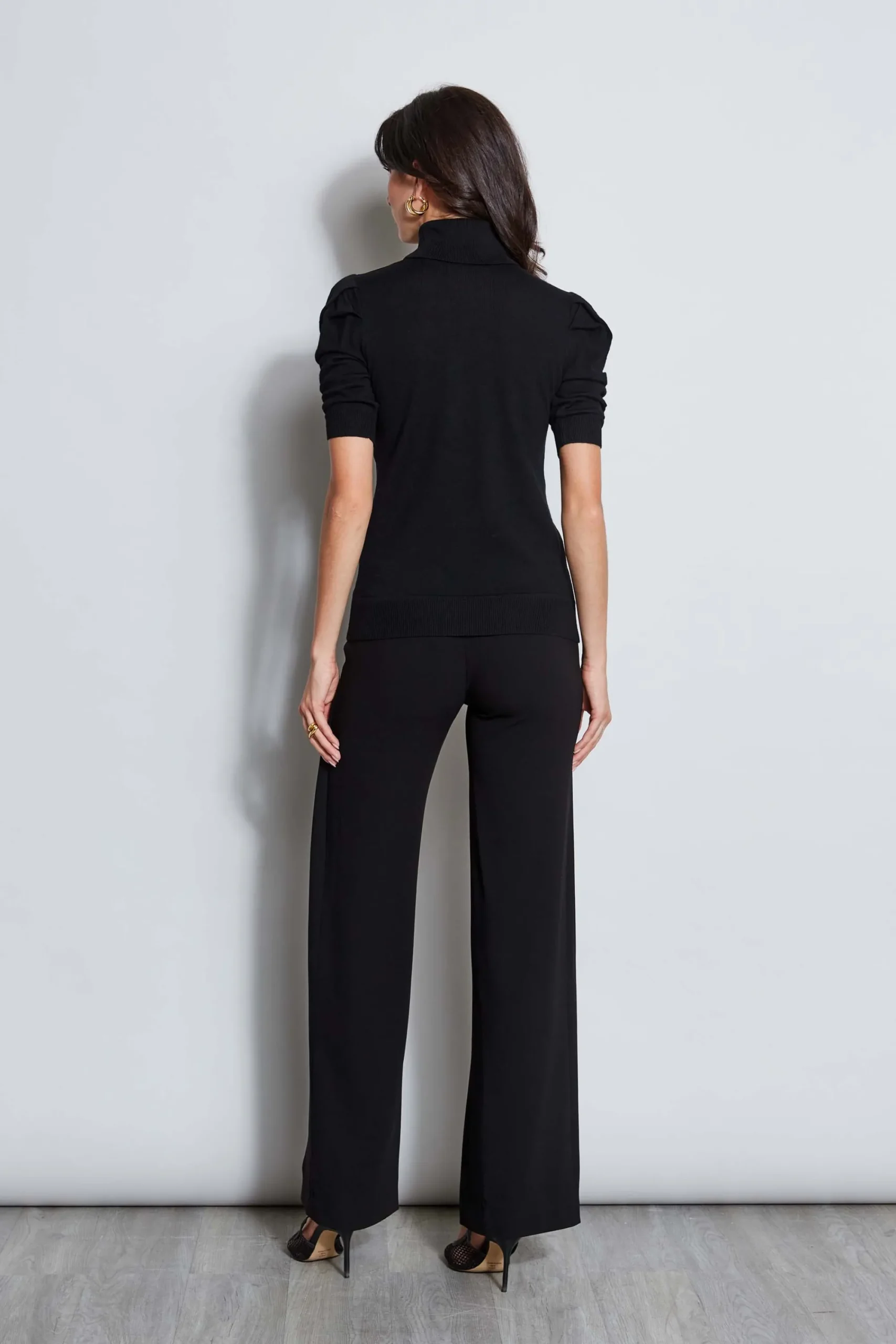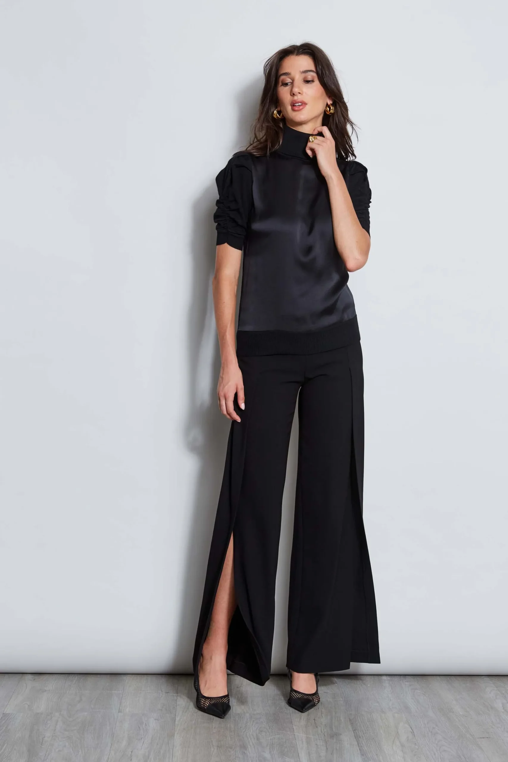 Our Silk Satin Front Turtleneck Sweater defines modern luxe dressing. The shimmer of Satin adds patina u0026amp; dimension to our short sleeve merino wool Sweater. Designed with ruched short sleeves, this piece will instantly elevate your wardrobe, whether layered or worn on its own. Elie Tahari Exclusive Short Ruched Sleeve Silk Satin Front Sweater with Merino Wool Back Front: 100% Silk Satin, Back: 100% Merino Wool Relaxed Fit; Runs true to Size Model is 5’9″ and wearing size S Length From Shoulder to Hem: Back 24.6″L, Sleeve 9 “L (approx. length for size S) Dry Clean Only Imported Style #: E85X5514