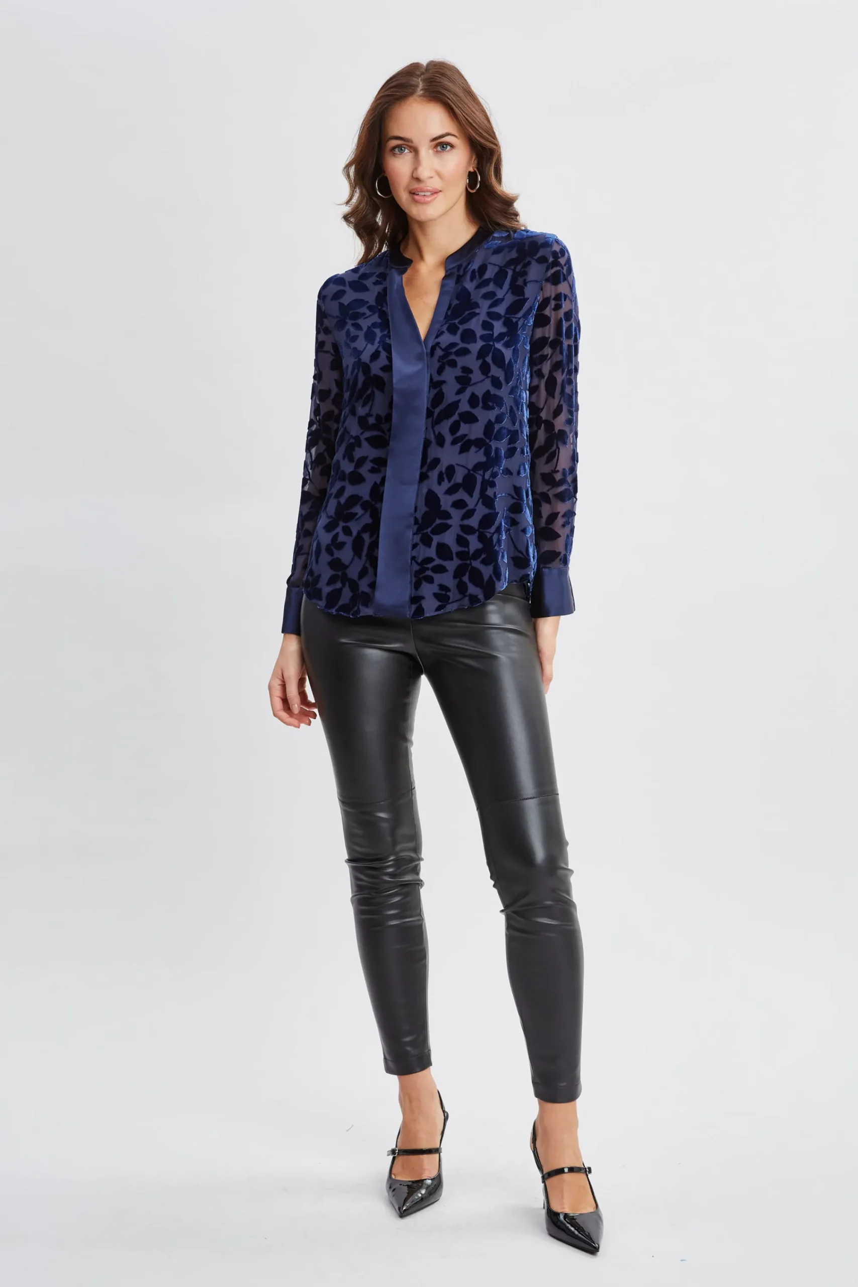 This is the top with the wow factor. A luxe burnout floral velvet lends the designer touch. The contrasting Satin stand …