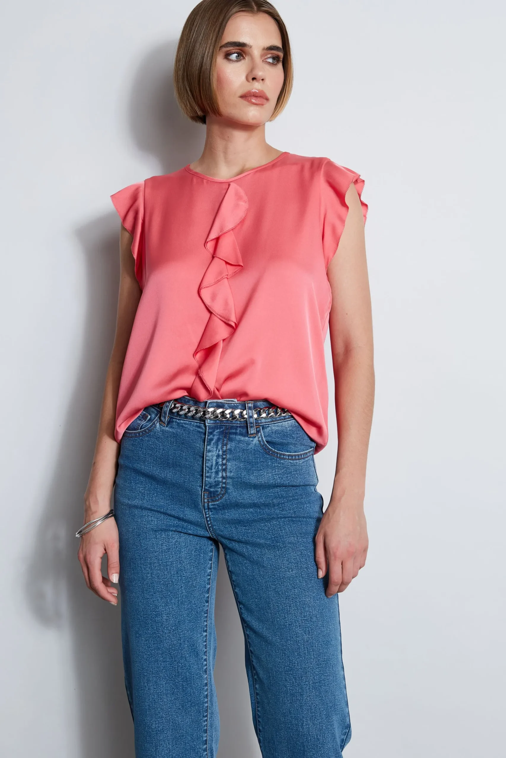 Every Spring wardrobe needs a chic Silk top. Upgrade yours with a charming cascade ruffle effect in luxe silk georgette. Detailed with flutter sleeves, it adds the right touch of femininity. Flutter Sleeve Ruffle Front Crewneck Top Runs true to size. Model is 5’9″ and wearing size S Dry Clean Only Imported Style #: ETR41378