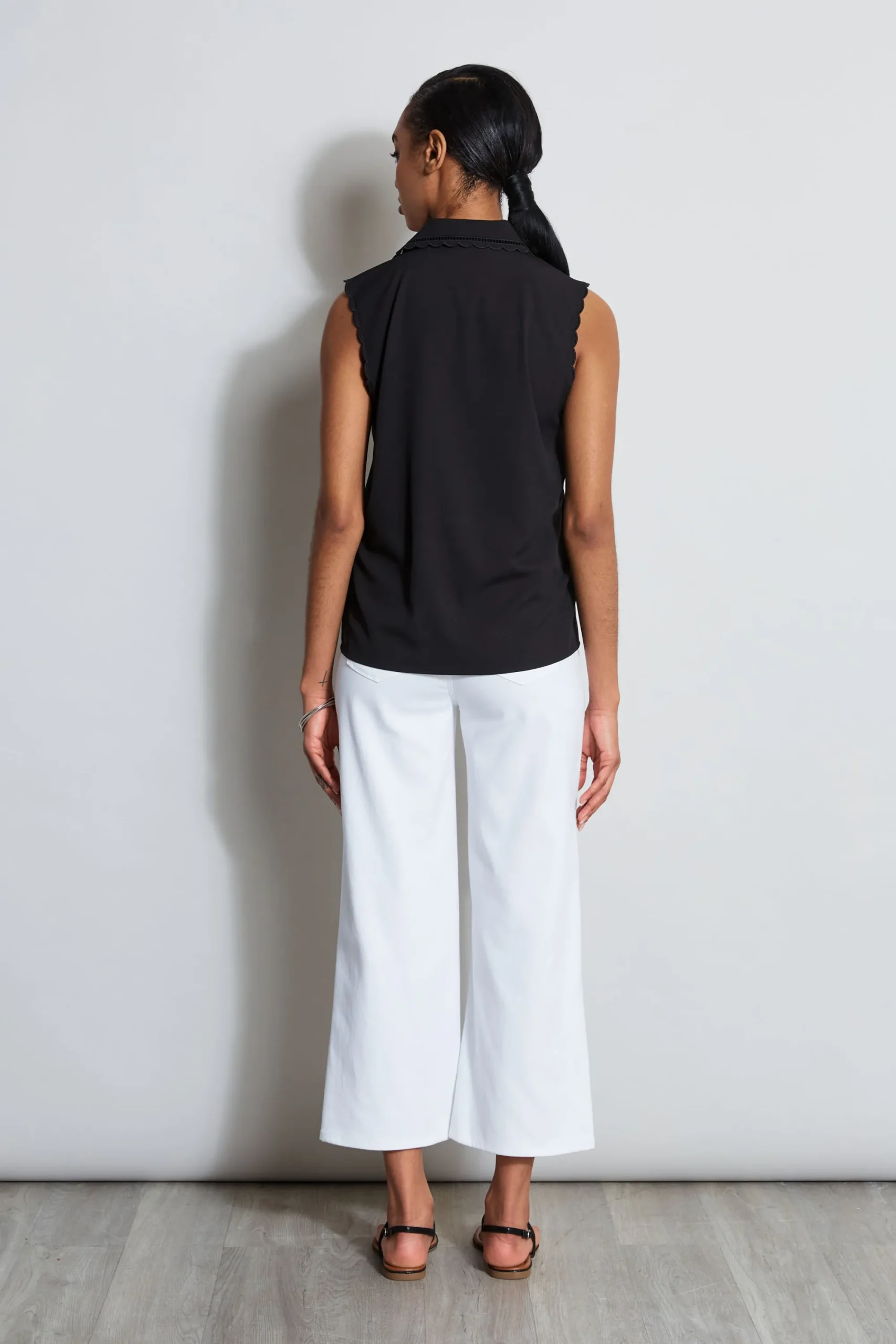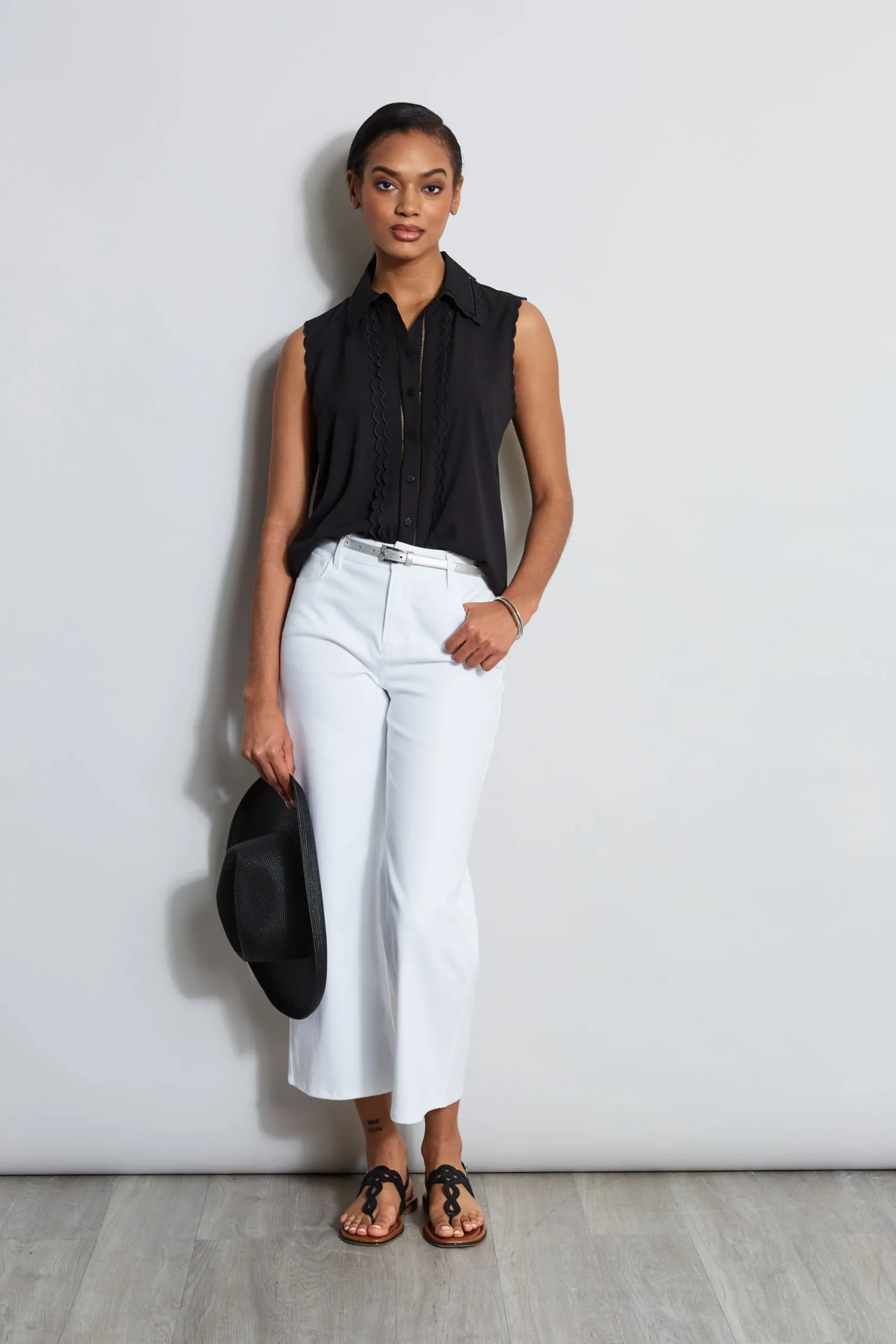 It’s all in the details! The easiest shirt for Summer is elevated with scallop detailing on the collar u0026amp; placket. Timeless u0026amp; ultra-chic, this top will take you from desk to dinner all season long. Sleeveless Detailed Button Down Shirt Runs true to size. 91% Polyester, 9% Spandex Model is 5’9″ and wearing size S Imported Style #: ETR41344