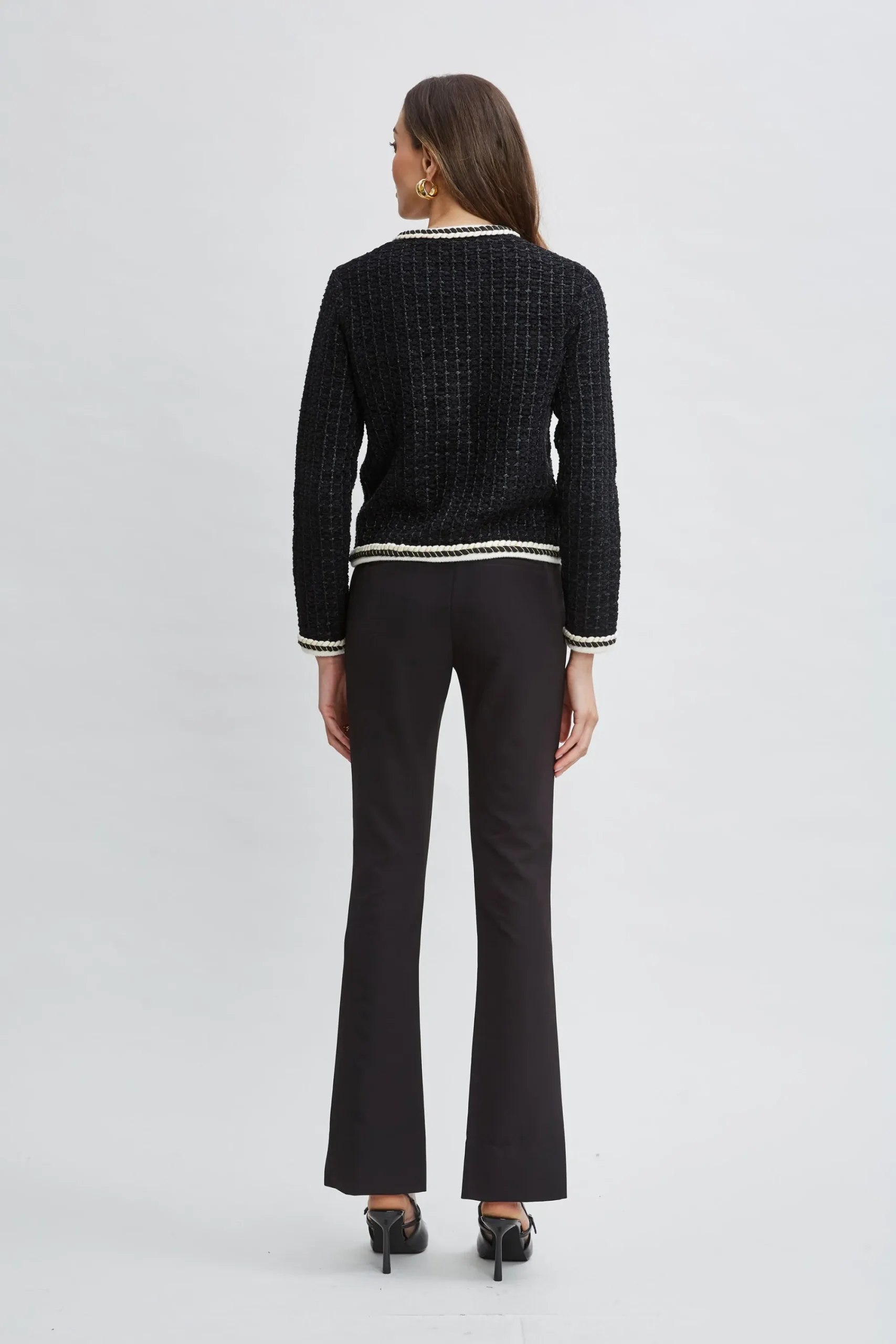 The contrasting trim on our wool blend cardigan sweater makes this a must have layering piece. Rich in texture, the metallic weave and stitching and gold crest buttons elevate every look. Metallic Tweed Contrast Cardigan Jacket 55% Wool, 25% Nylon, 20% Cotton Runs true to size. Model is 5’9″ and wearing size S Dry Clean Only Imported Style #: ETR44258